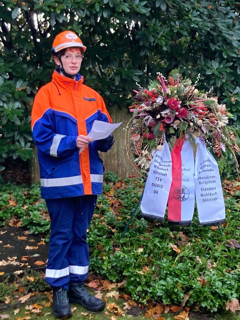 Eine Jugendliche der FFW Ohlstedt hielt eine sehr ambitionierte und emotioale Rede, in der sie der Toten gedachte, aber auch für Frieden mit dem Hinweis auf die Kriegsschauplätze in der Ukraine und in Israel plädierte. Es folgte eine Gedenkminute, um das Ereignis und den Augenblick zu würdigen.